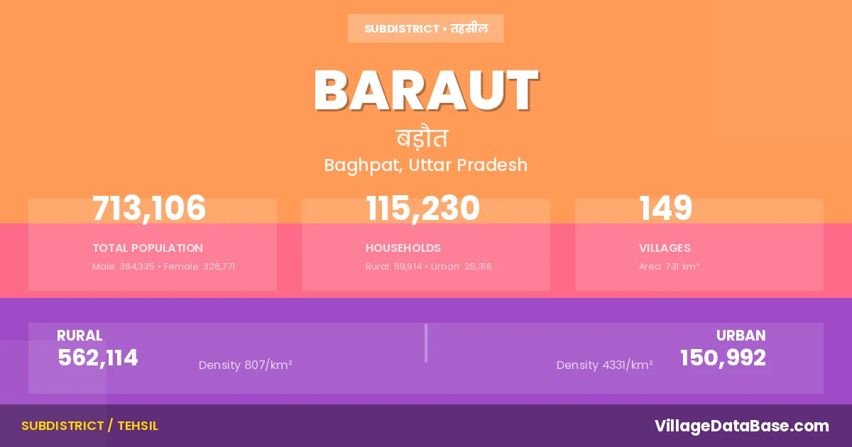According to the 2011 census The total area of Baraut Tehsil is 731 km², with a population of 713106 people. The population density is 976 inhabitants per square kilometre, and there are approximately 115230 houses in the sub district.