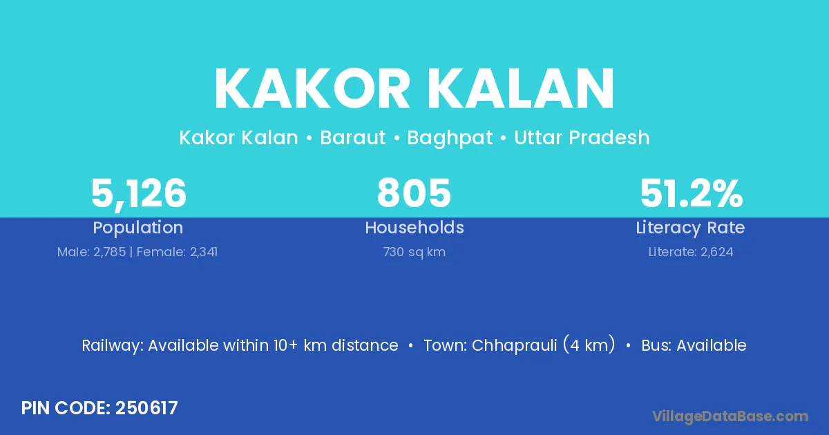 Chhaprauli (4 km) is the nearest town to Kakor Kalan village for major economic activities and is located approximately 4 km away.