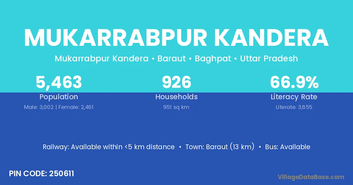 Baraut (13 km) is the nearest town to Mukarrabpur Kandera village for major economic activities and is located approximately 13 km away.