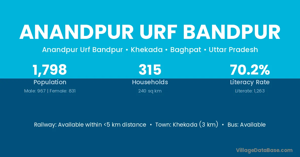 Anandpur Urf Bandpur village has a total population of 1,798 people, of which 967 are males and 831 are females.
