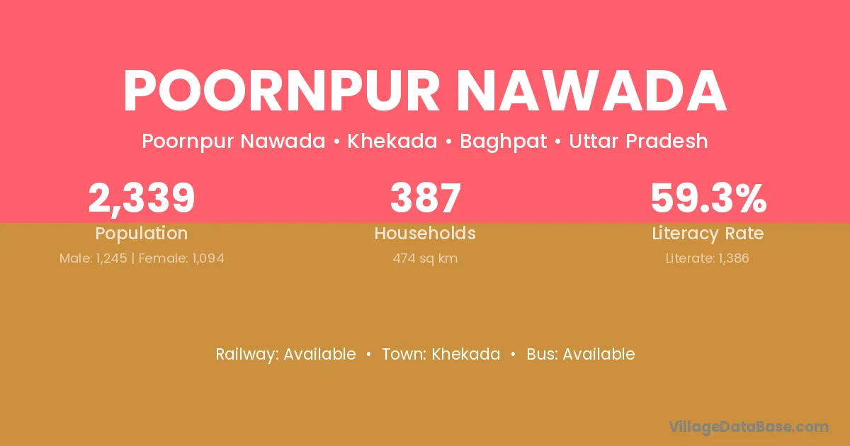 Poornpur Nawada village has a total population of 2,339 people, of which 1,245 are males and 1,094 are females.