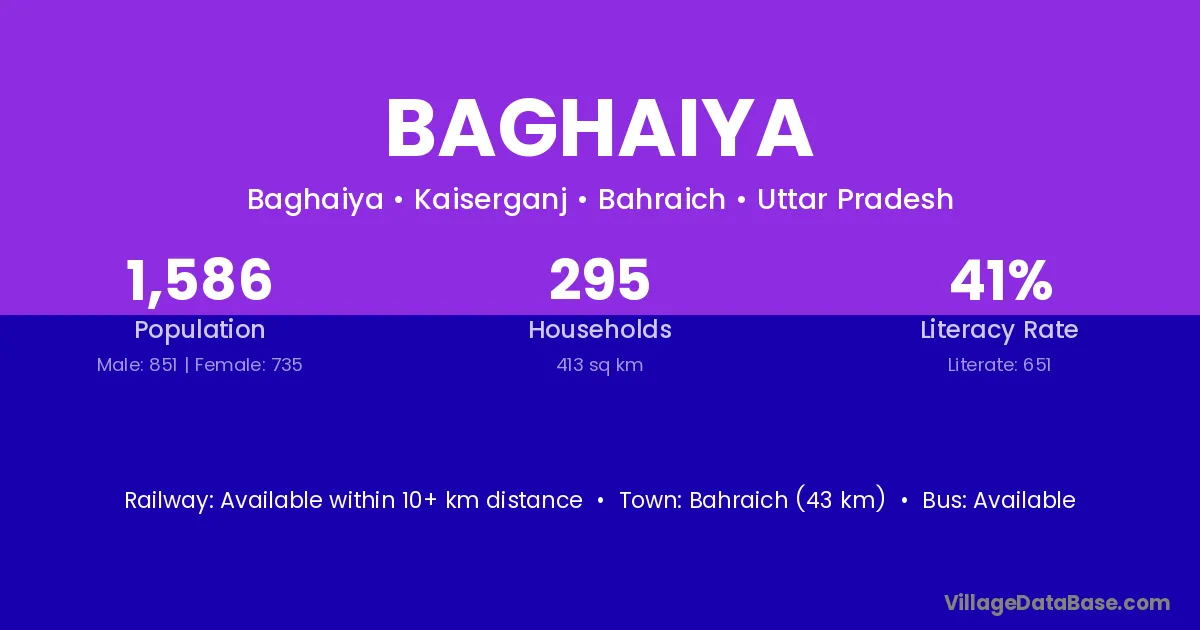 Bahraich (43 km) is the nearest town to Baghaiya village for major economic activities and is located approximately 43 km away.
