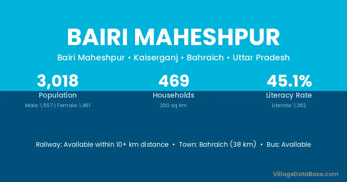 Bahraich (38 km) is the nearest town to Bairi Maheshpur village for major economic activities and is located approximately 38 km away.