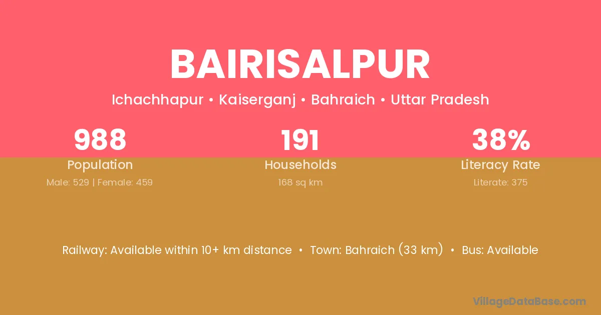 Bahraich (33 km) is the nearest town to Bairisalpur village for major economic activities and is located approximately 33 km away.