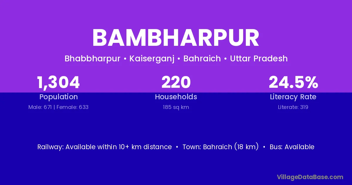 Bahraich (18 km) is the nearest town to Bambharpur village for major economic activities and is located approximately 18 km away.