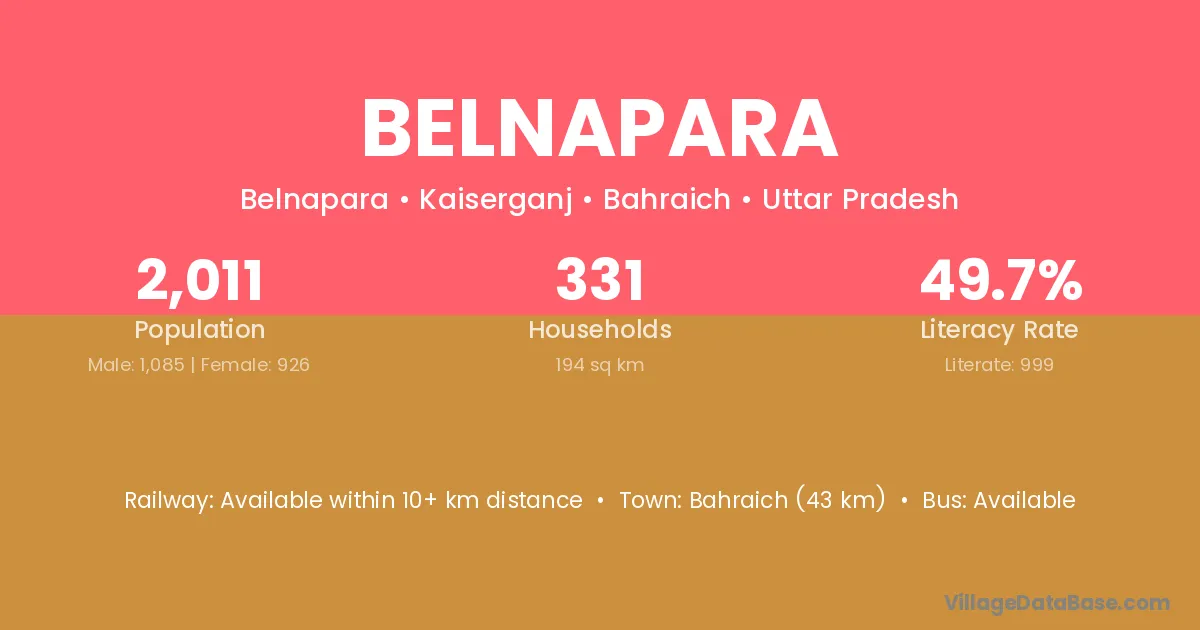 Bahraich (43 km) is the nearest town to Belnapara village for major economic activities and is located approximately 43 km away.