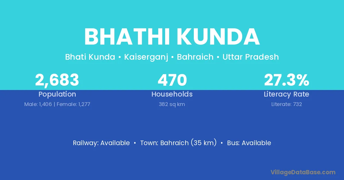 Bahraich (35 km) is the nearest town to Bhathi Kunda village for major economic activities and is located approximately 35 km away.