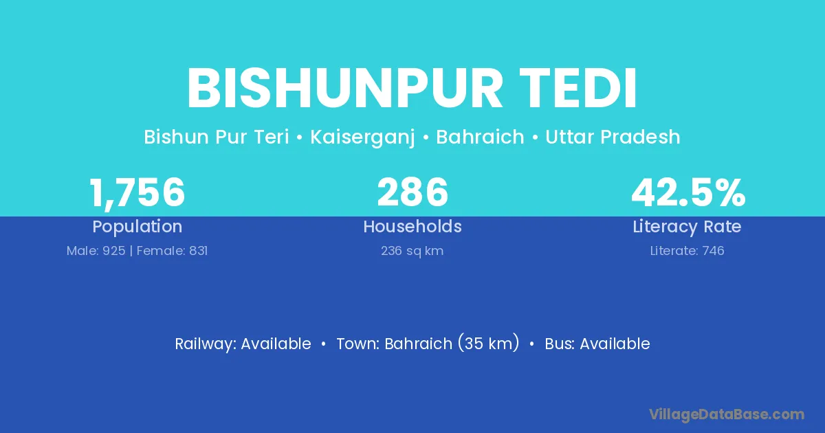 Bahraich (35 km) is the nearest town to Bishunpur Tedi village for major economic activities and is located approximately 35 km away.
