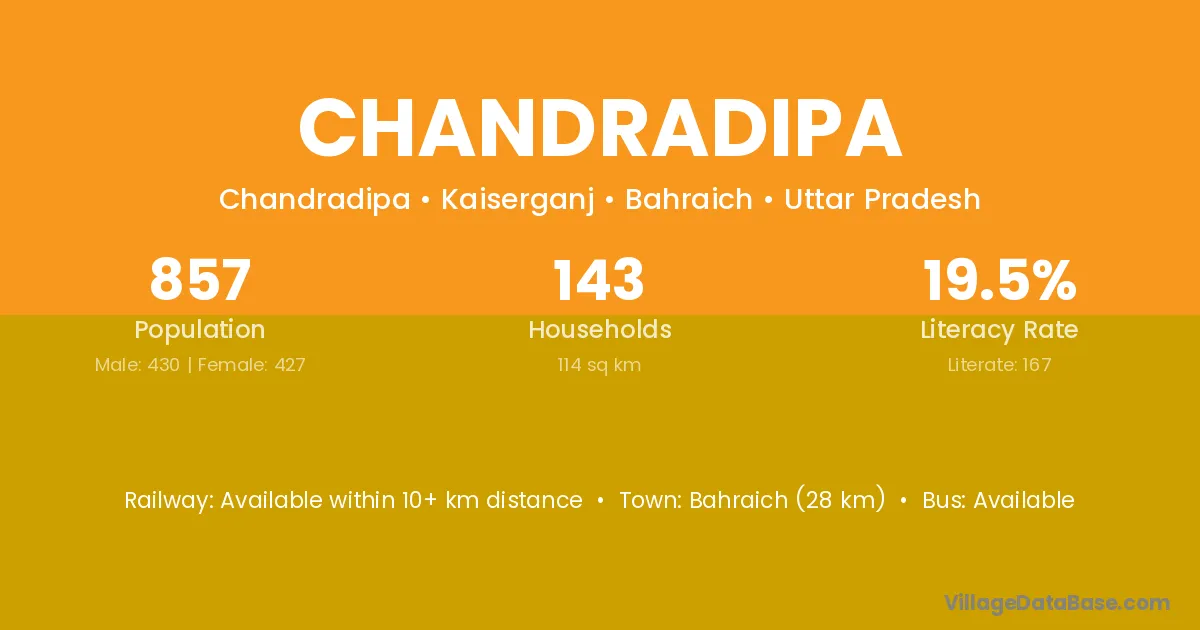 Bahraich (28 km) is the nearest town to Chandradipa village for major economic activities and is located approximately 28 km away.