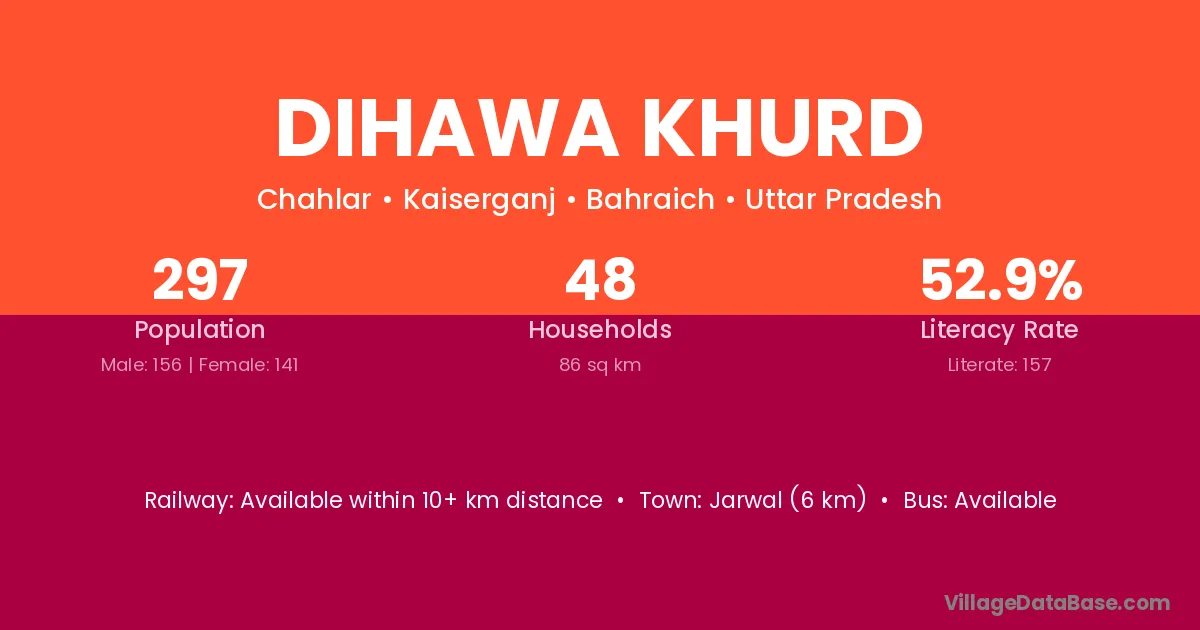 Dihawa Khurd village has a total population of 297 people, of which 156 are males and 141 are females.
