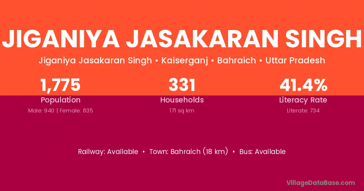 Bahraich (18 km) is the nearest town to Jiganiya Jasakaran Singh village for major economic activities and is located approximately 18 km away.