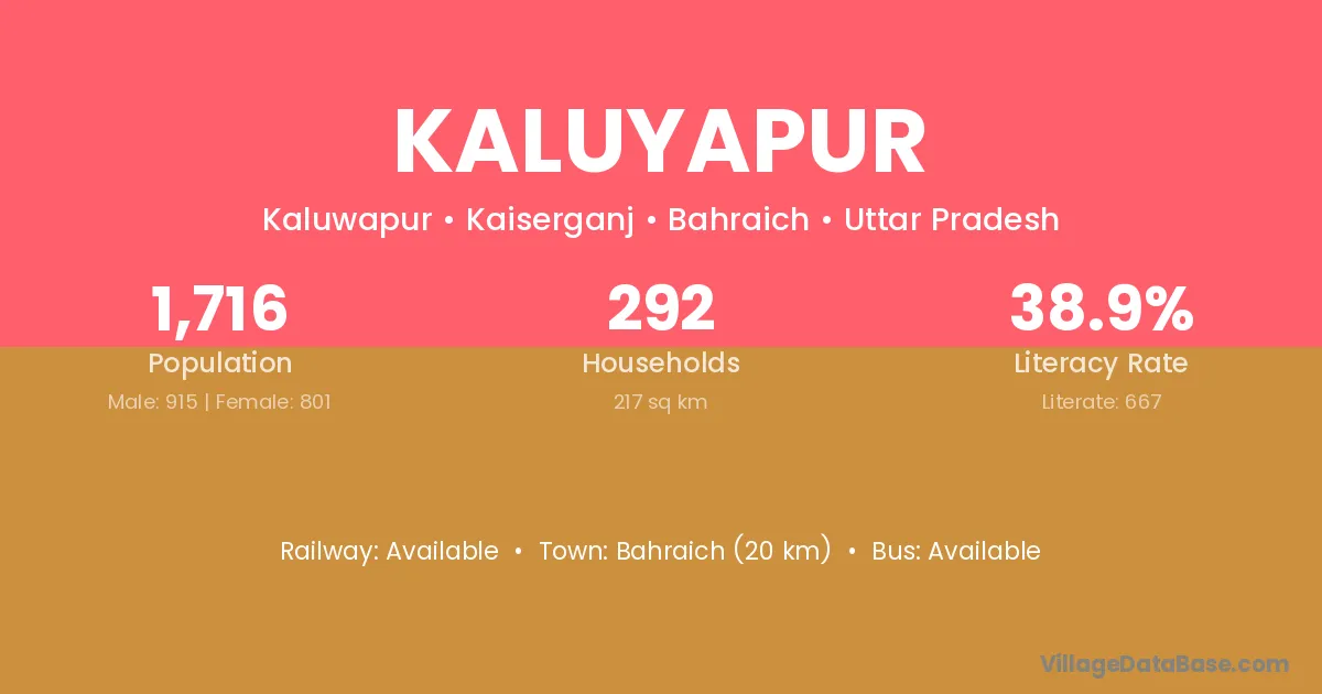 Bahraich (20 km) is the nearest town to Kaluyapur village for major economic activities and is located approximately 20 km away.