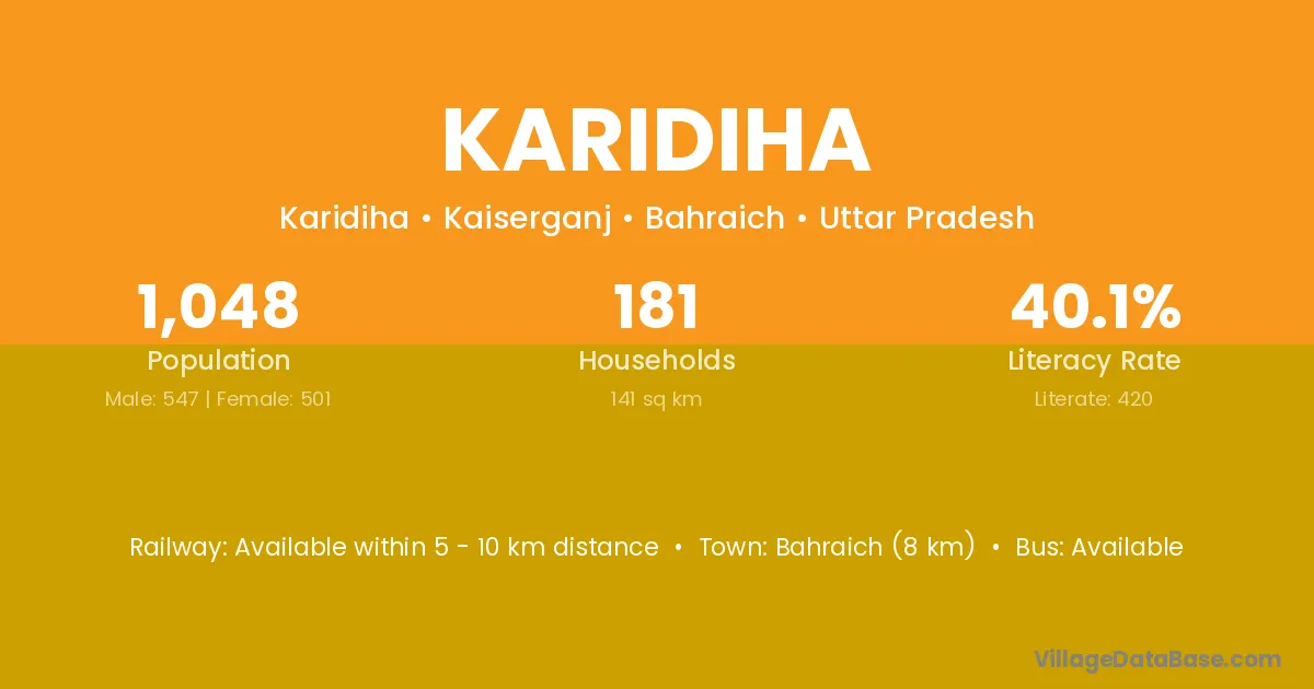 Bahraich (8 km) is the nearest town to Karidiha village for major economic activities and is located approximately 8 km away.