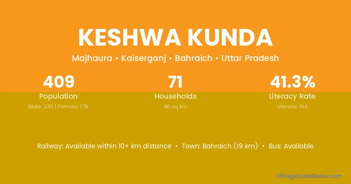 Bahraich (19 km) is the nearest town to Keshwa Kunda village for major economic activities and is located approximately 19 km away.