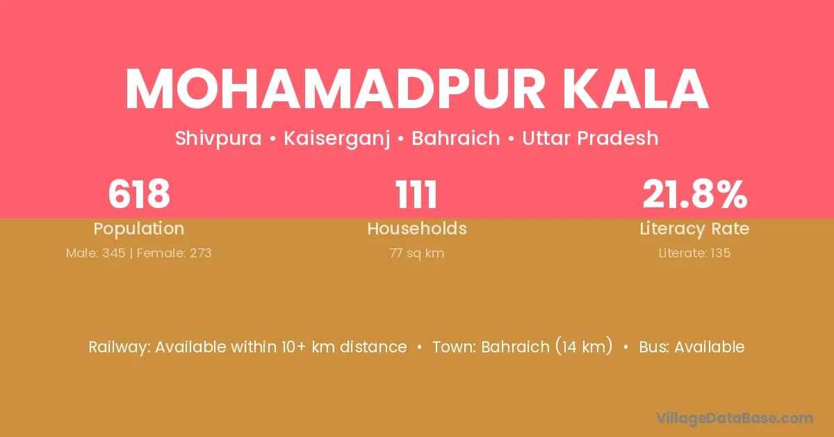 Bahraich (14 km) is the nearest town to Mohamadpur Kala village for major economic activities and is located approximately 14 km away.