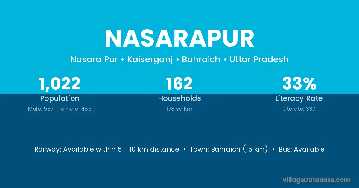 Bahraich (15 km) is the nearest town to Nasarapur village for major economic activities and is located approximately 15 km away.