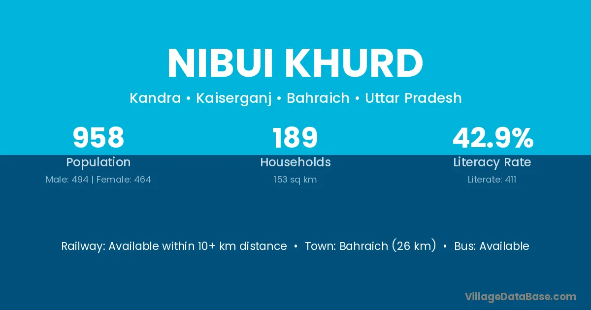 Bahraich (26 km) is the nearest town to Nibui Khurd village for major economic activities and is located approximately 26 km away.