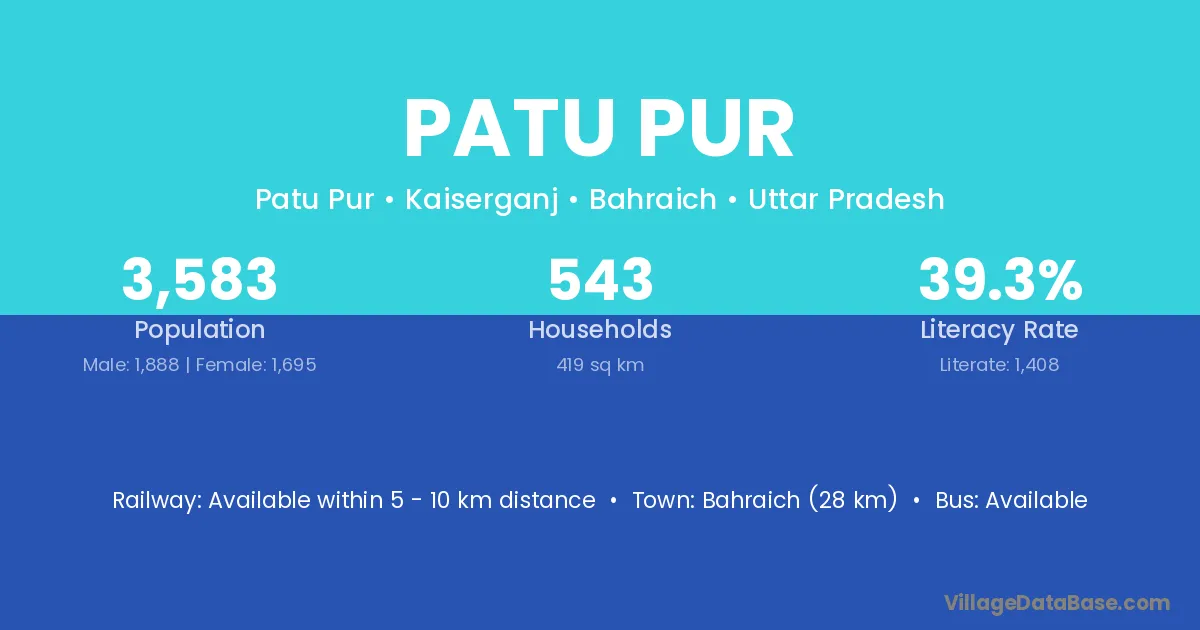 Bahraich (28 km) is the nearest town to Patu Pur village for major economic activities and is located approximately 28 km away.