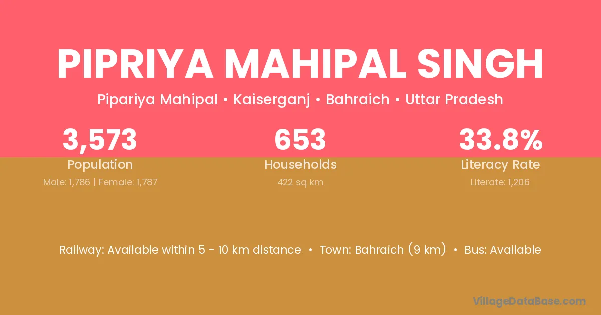 Bahraich (9 km) is the nearest town to Pipriya Mahipal Singh village for major economic activities and is located approximately 9 km away.
