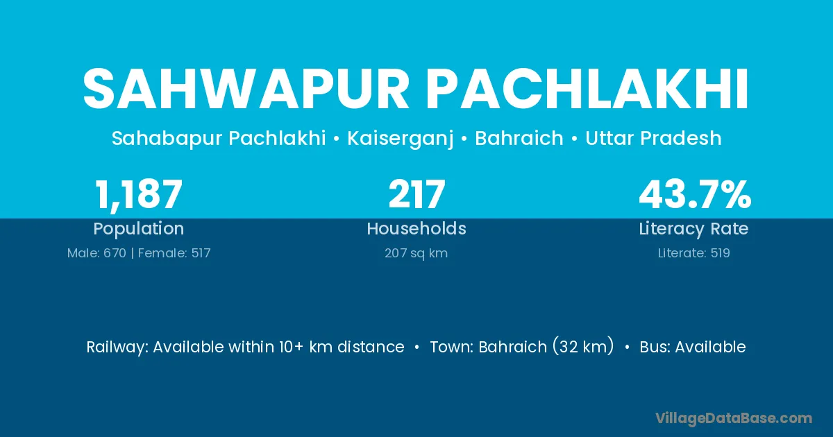 Bahraich (32 km) is the nearest town to Sahwapur Pachlakhi village for major economic activities and is located approximately 32 km away.