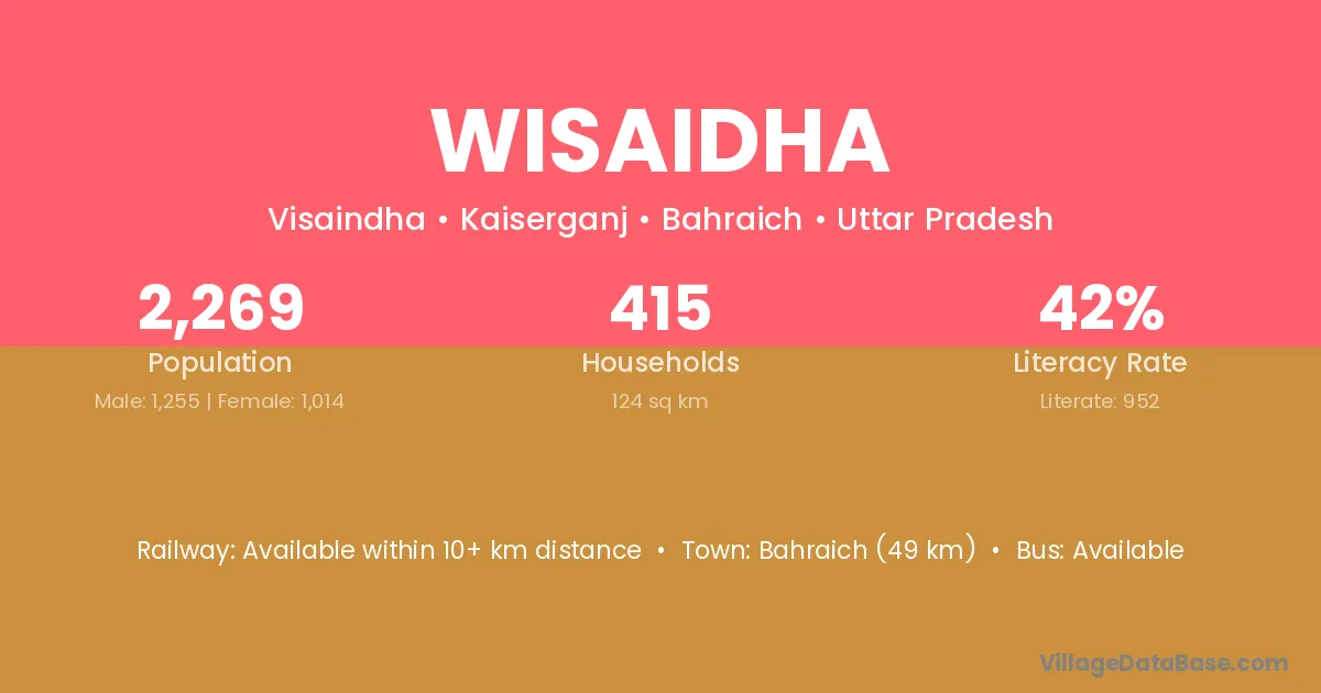 Bahraich (49 km) is the nearest town to Wisaidha village for major economic activities and is located approximately 49 km away.