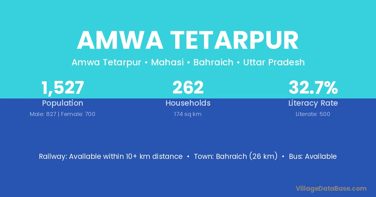 Bahraich (26 km) is the nearest town to Amwa Tetarpur village for major economic activities and is located approximately 26 km away.