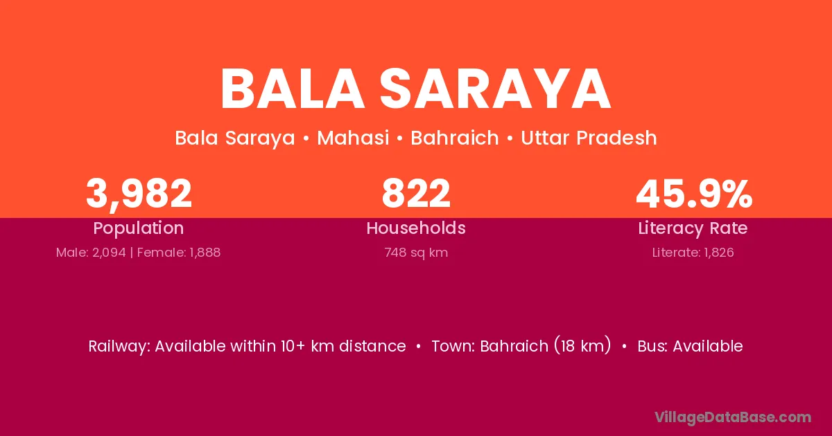Bahraich (18 km) is the nearest town to Bala Saraya village for major economic activities and is located approximately 18 km away.