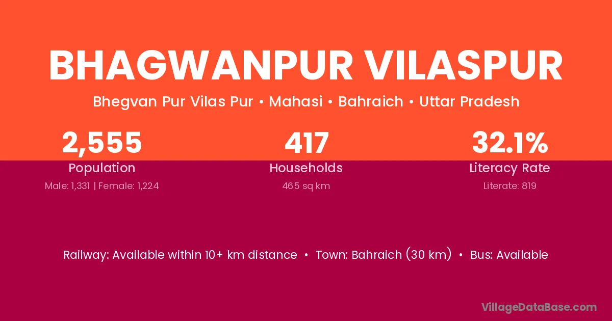 Bahraich (30 km) is the nearest town to Bhagwanpur Vilaspur village for major economic activities and is located approximately 30 km away.
