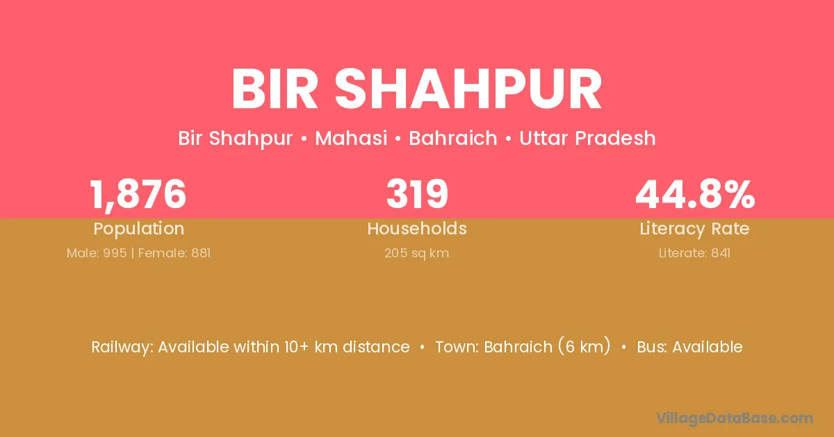 Bahraich (6 km) is the nearest town to Bir Shahpur village for major economic activities and is located approximately 6 km away.