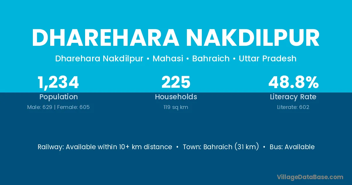 Bahraich (31 km) is the nearest town to Dharehara Nakdilpur village for major economic activities and is located approximately 31 km away.