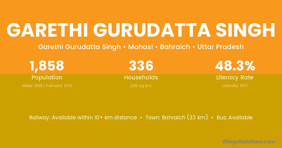 Bahraich (33 km) is the nearest town to Garethi Gurudatta Singh village for major economic activities and is located approximately 33 km away.
