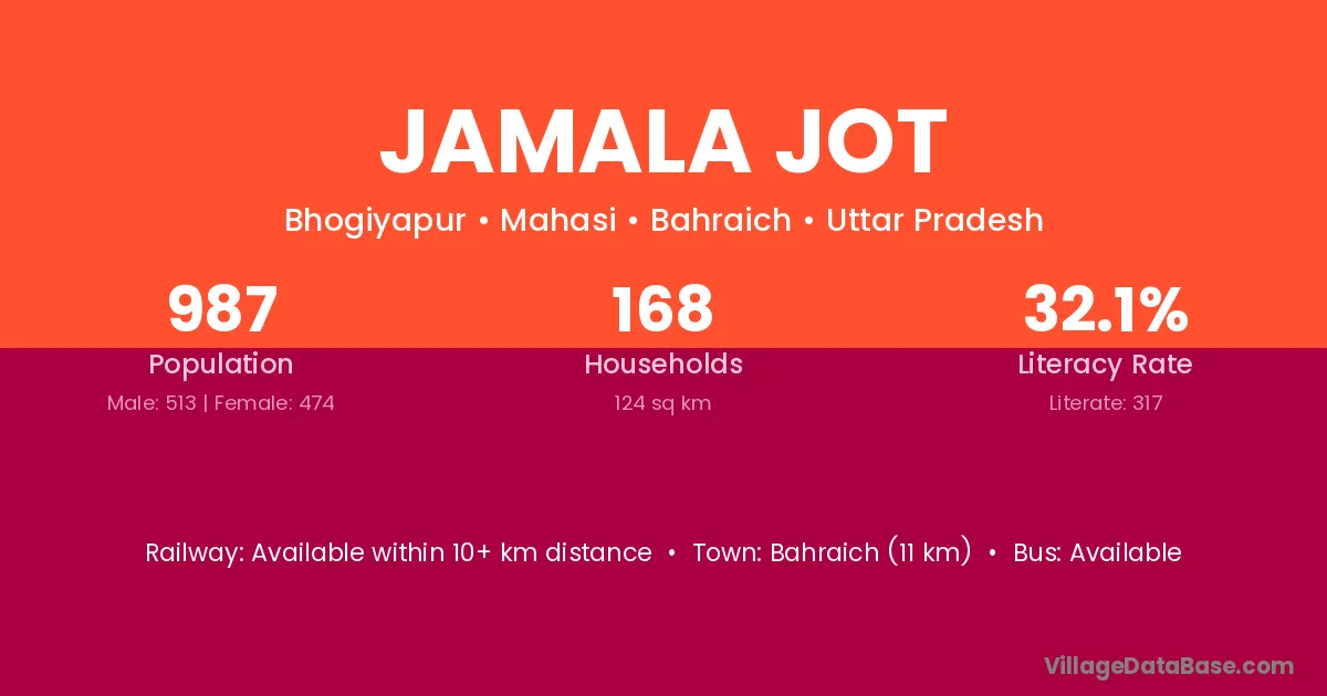 Bahraich (11 km) is the nearest town to Jamala Jot village for major economic activities and is located approximately 11 km away.