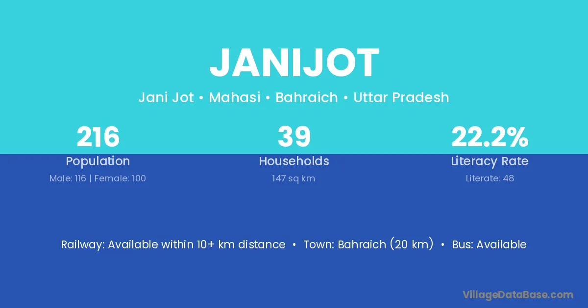 Bahraich (20 km) is the nearest town to Janijot village for major economic activities and is located approximately 20 km away.