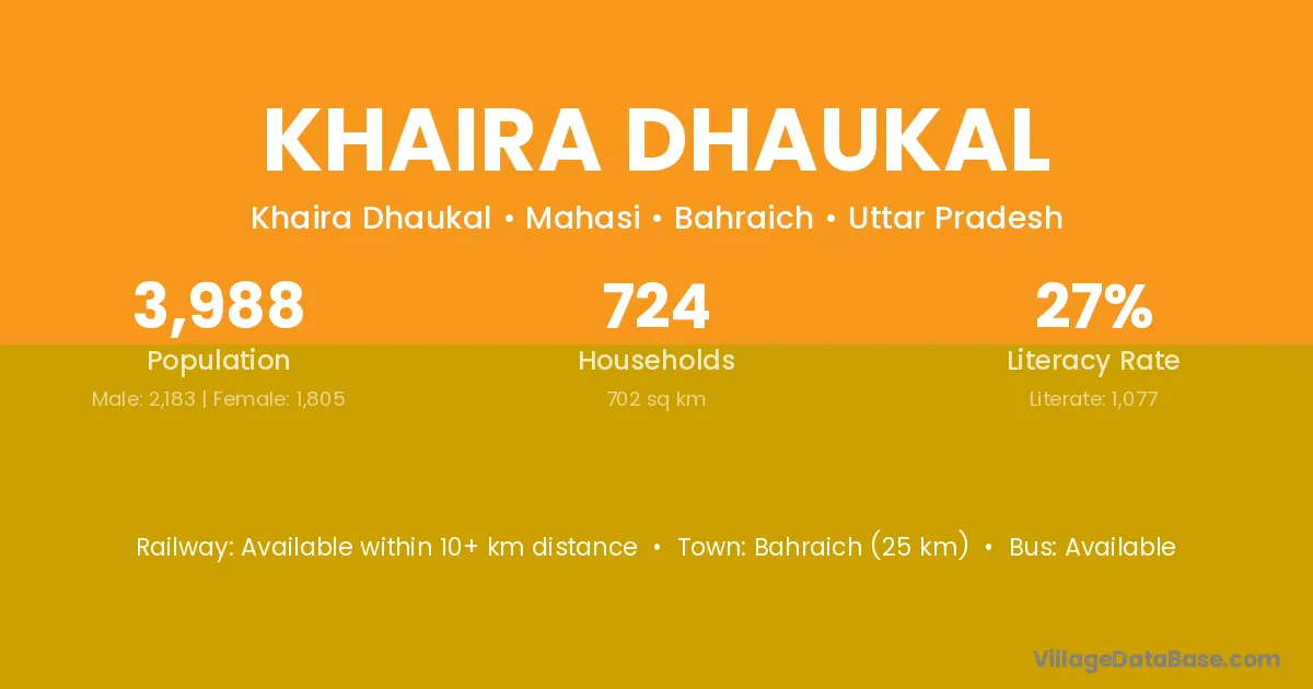 Bahraich (25 km) is the nearest town to Khaira Dhaukal village for major economic activities and is located approximately 25 km away.