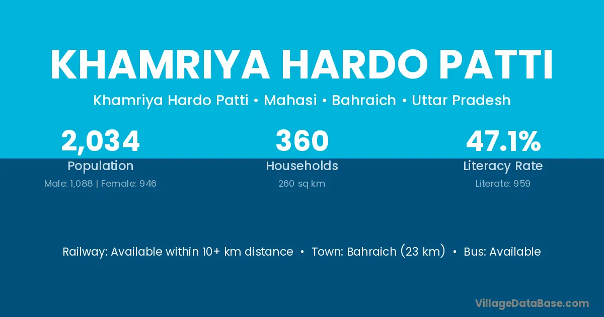 Bahraich (23 km) is the nearest town to Khamriya Hardo Patti village for major economic activities and is located approximately 23 km away.
