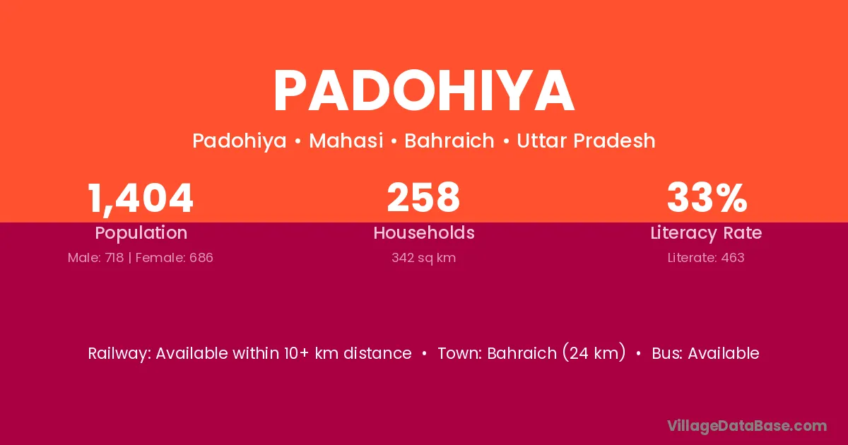 Bahraich (24 km) is the nearest town to Padohiya village for major economic activities and is located approximately 24 km away.