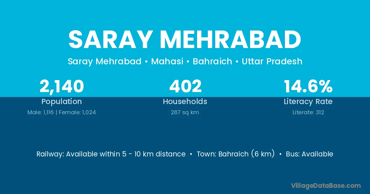 Bahraich (6 km) is the nearest town to Saray Mehrabad village for major economic activities and is located approximately 6 km away.