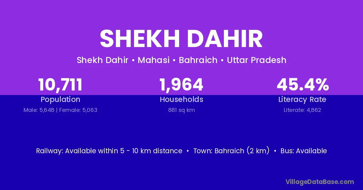 Bahraich (2 km) is the nearest town to Shekh Dahir village for major economic activities and is located approximately 2 km away.