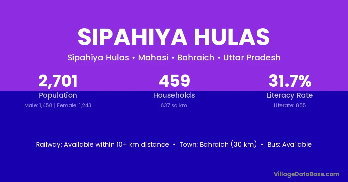 Bahraich (30 km) is the nearest town to Sipahiya Hulas village for major economic activities and is located approximately 30 km away.