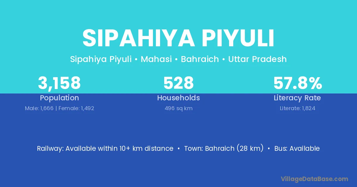 Bahraich (28 km) is the nearest town to Sipahiya Piyuli village for major economic activities and is located approximately 28 km away.