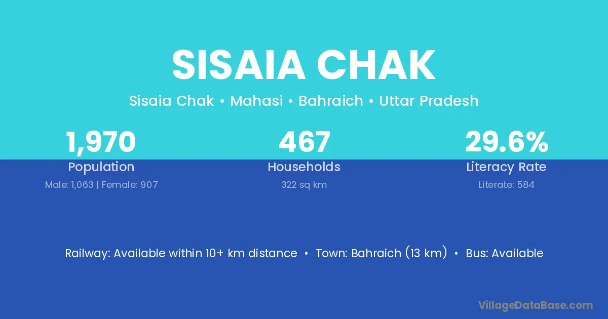 Bahraich (13 km) is the nearest town to Sisaia Chak village for major economic activities and is located approximately 13 km away.