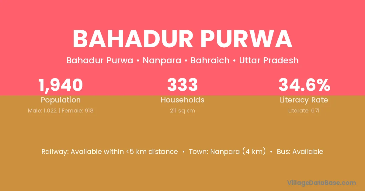 Nanpara (4 km) is the nearest town to Bahadur Purwa village for major economic activities and is located approximately 4 km away.