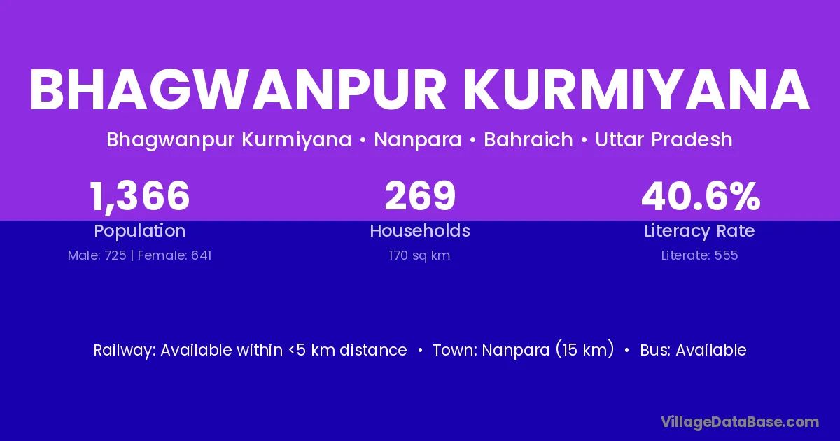 Nanpara (15 km) is the nearest town to Bhagwanpur Kurmiyana village for major economic activities and is located approximately 15 km away.