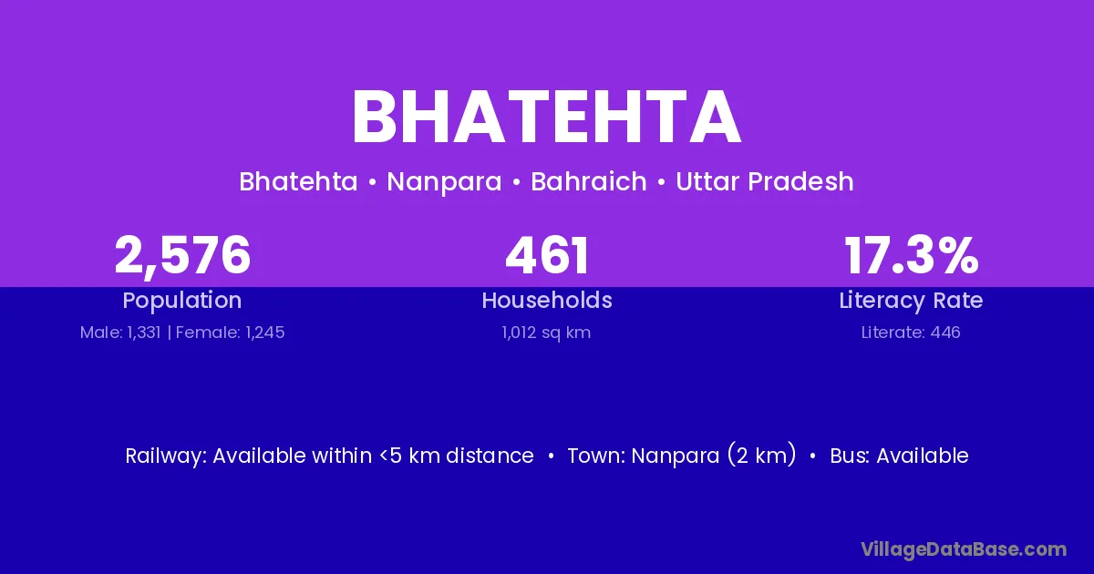 Nanpara (2 km) is the nearest town to Bhatehta village for major economic activities and is located approximately 2 km away.