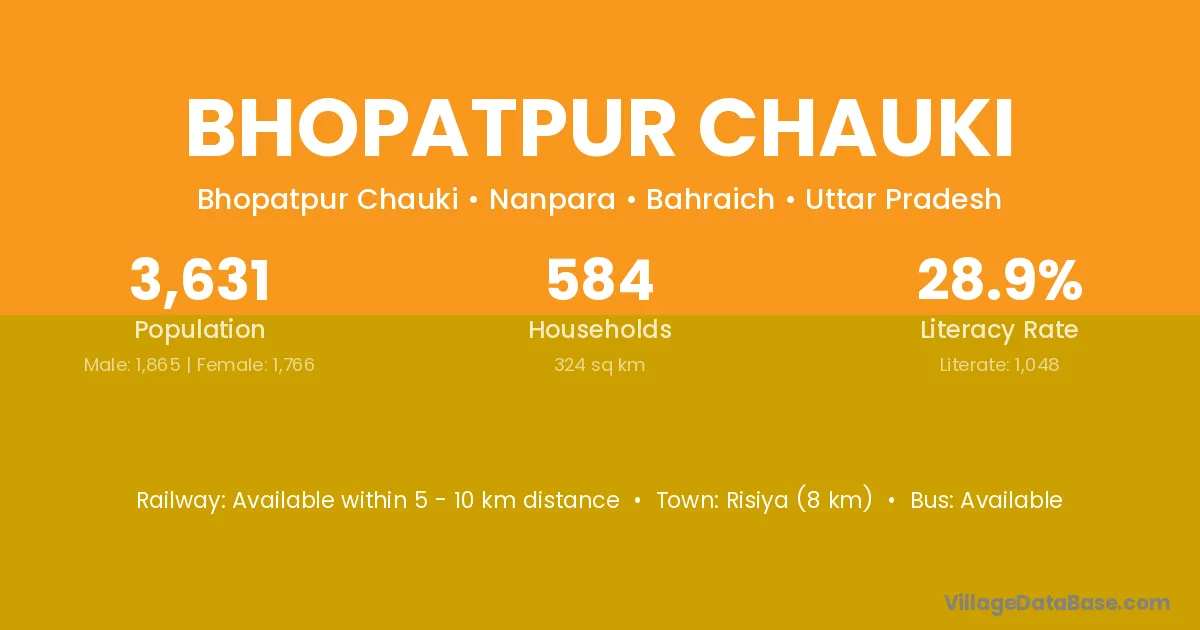 Bhopatpur Chauki village has a total population of 3,631 people, of which 1,865 are males and 1,766 are females.