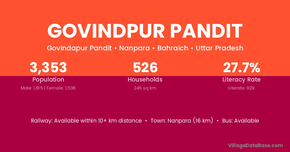 Nanpara (16 km) is the nearest town to Govindpur Pandit village for major economic activities and is located approximately 16 km away.