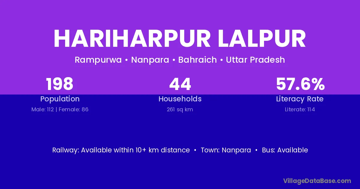 Hariharpur Lalpur village has a total population of 198 people, of which 112 are males and 86 are females.
