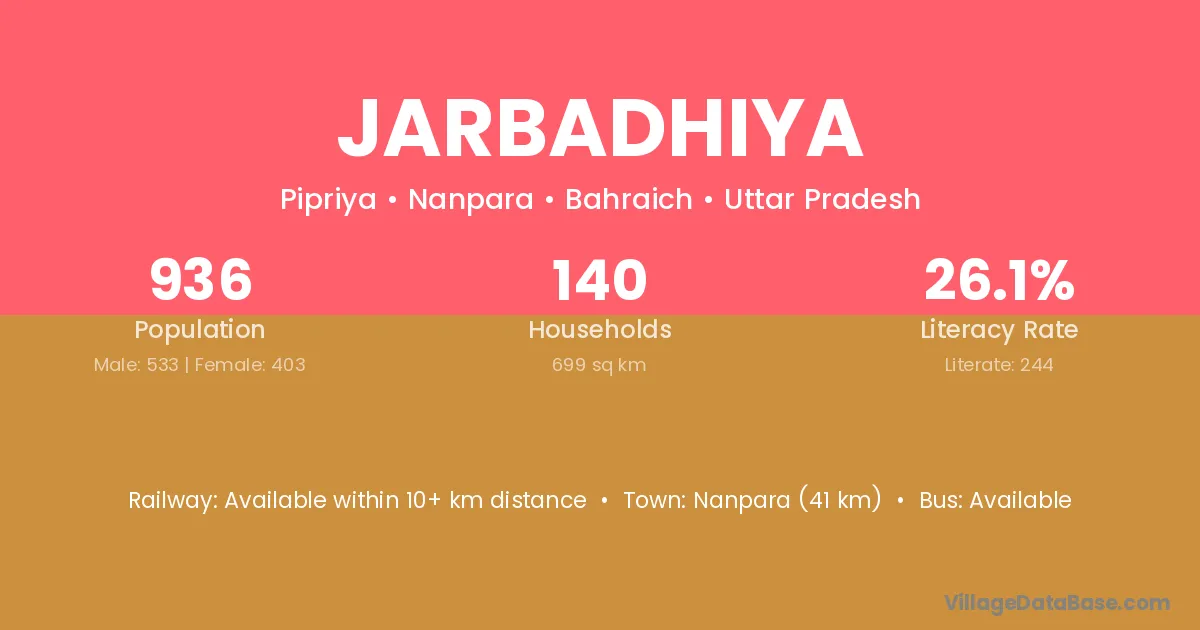 Nanpara (41 km) is the nearest town to Jarbadhiya village for major economic activities and is located approximately 41 km away.