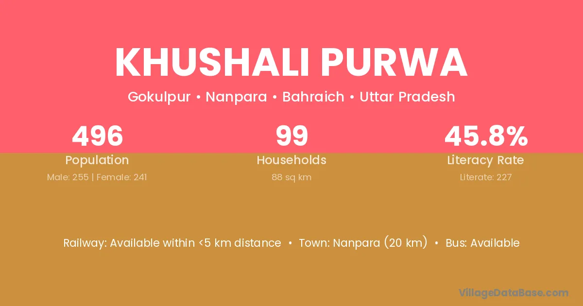 Nanpara (20 km) is the nearest town to Khushali Purwa village for major economic activities and is located approximately 20 km away.