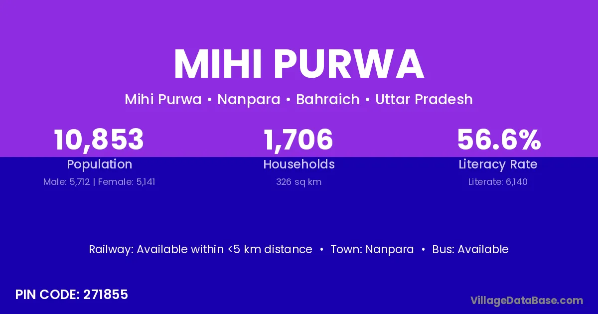 Mihi Purwa village has a total population of 10,853 people, of which 5,712 are males and 5,141 are females.